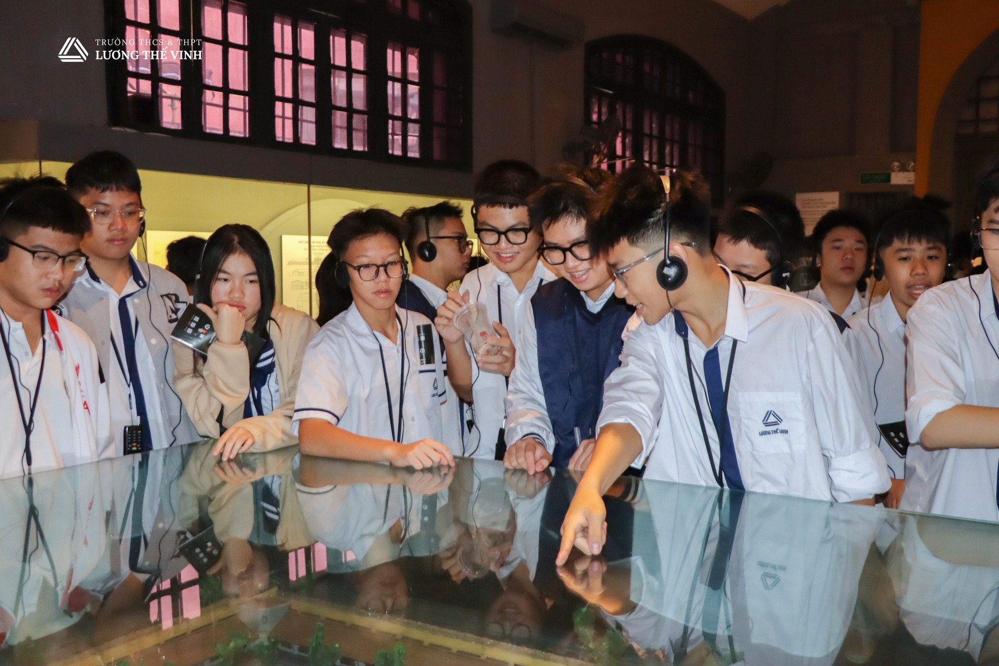 Ngay từ những bước chân đầu tiên vào cổng di tích, các em được trang bị thiết bị nghe thuyết minh tự động. Đây là “người bạn” đồng hành lặng lẽ nhưng sống động, dẫn dắt các em qua hơn 30 điểm trưng bày cùng những câu chuyện lịch sử đầy ám ảnh nhưng cũng đầy cảm động.
