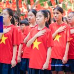 - Khối 6 gây ấn tượng bằng tiết mục xếp hình bản đồ Tổ quốc “Dưới mái trường vẽ dáng hình Tổ quốc”. Từ trên cao, flycam ghi lại hình ảnh 425 học sinh, gửi đi thông điệp: Tình yêu nước được ươm mầm từ những bước đi đầu đời.