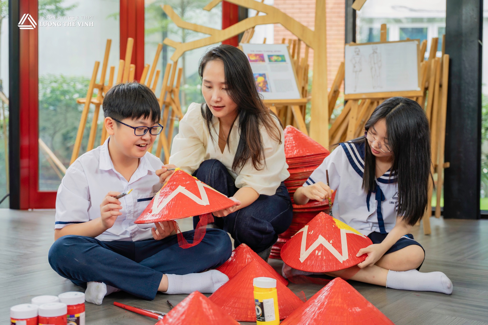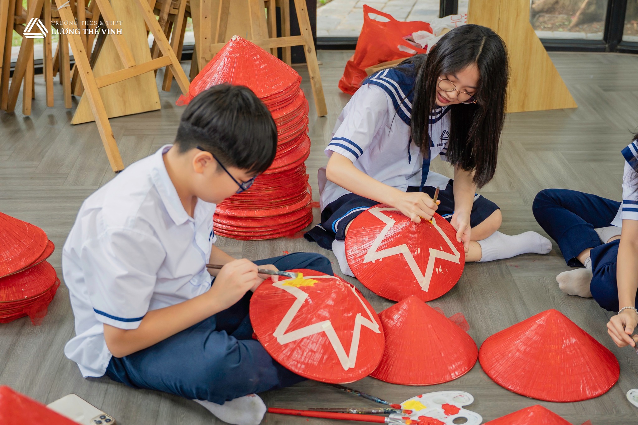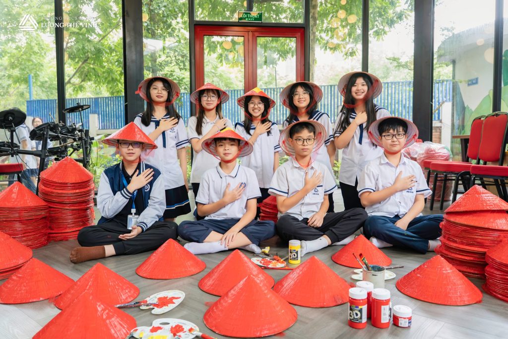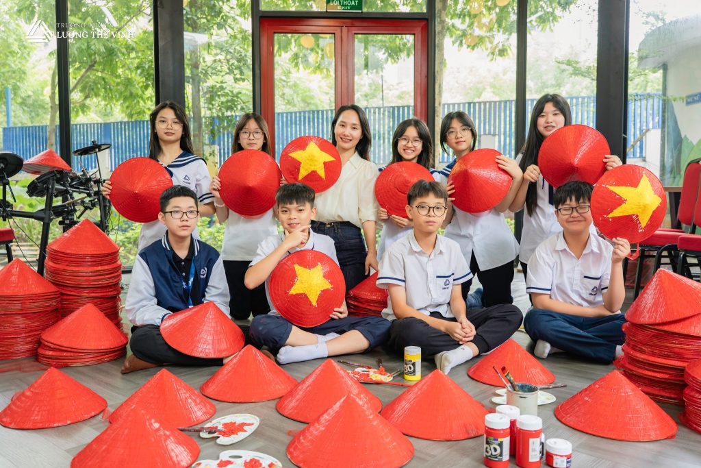Hòa trong dòng chảy tự hào dân tộc, hoạt động Mỹ thuật của cô trò Trường THCS & THPT Lương Thế Vinh – Cơ sở Cầu Giấy mang một màu sắc rất riêng, những chiếc nón được các họa sĩ nhí “khoác áo mới” với hình ảnh lá cờ đỏ sao vàng rực rỡ.