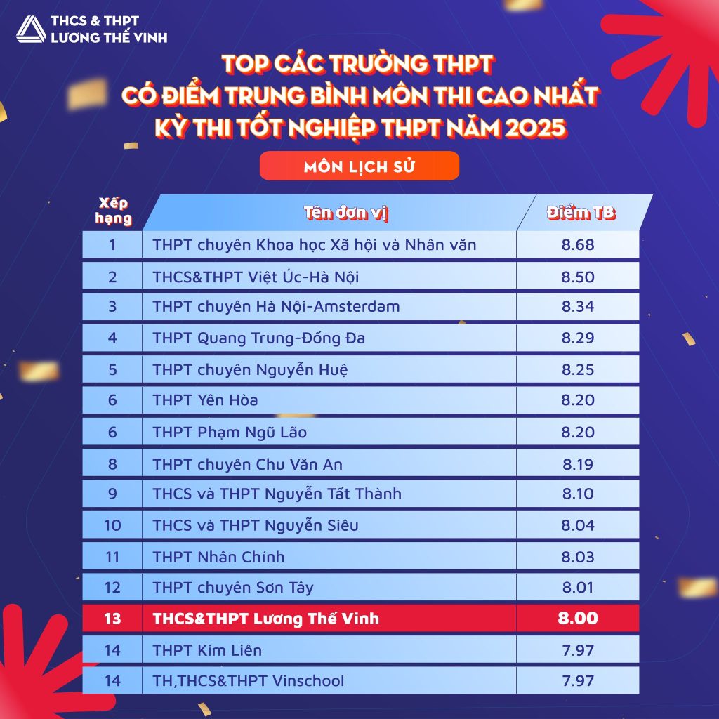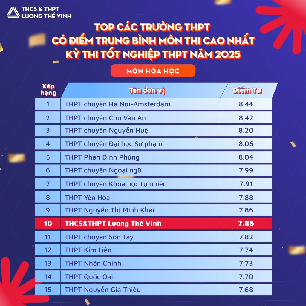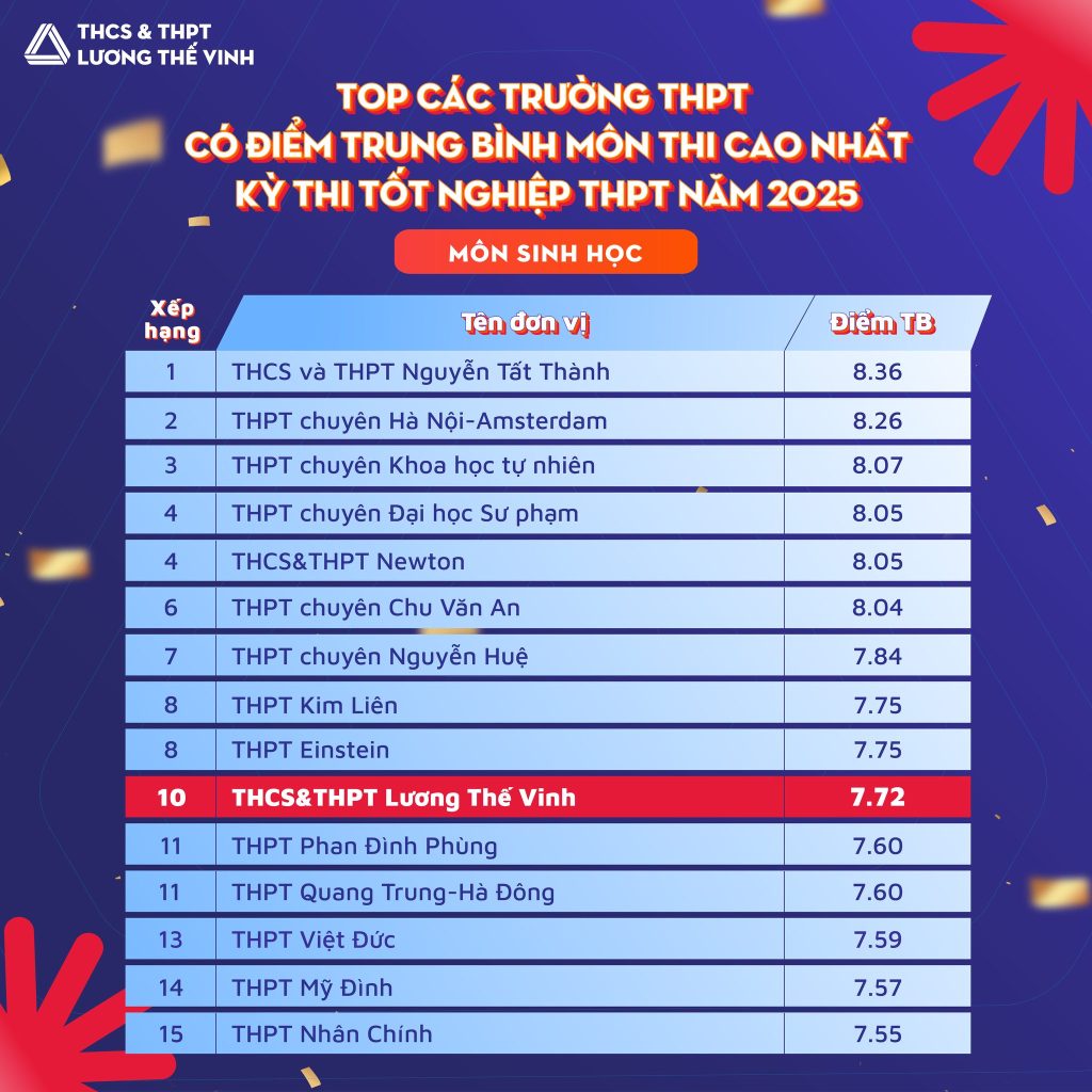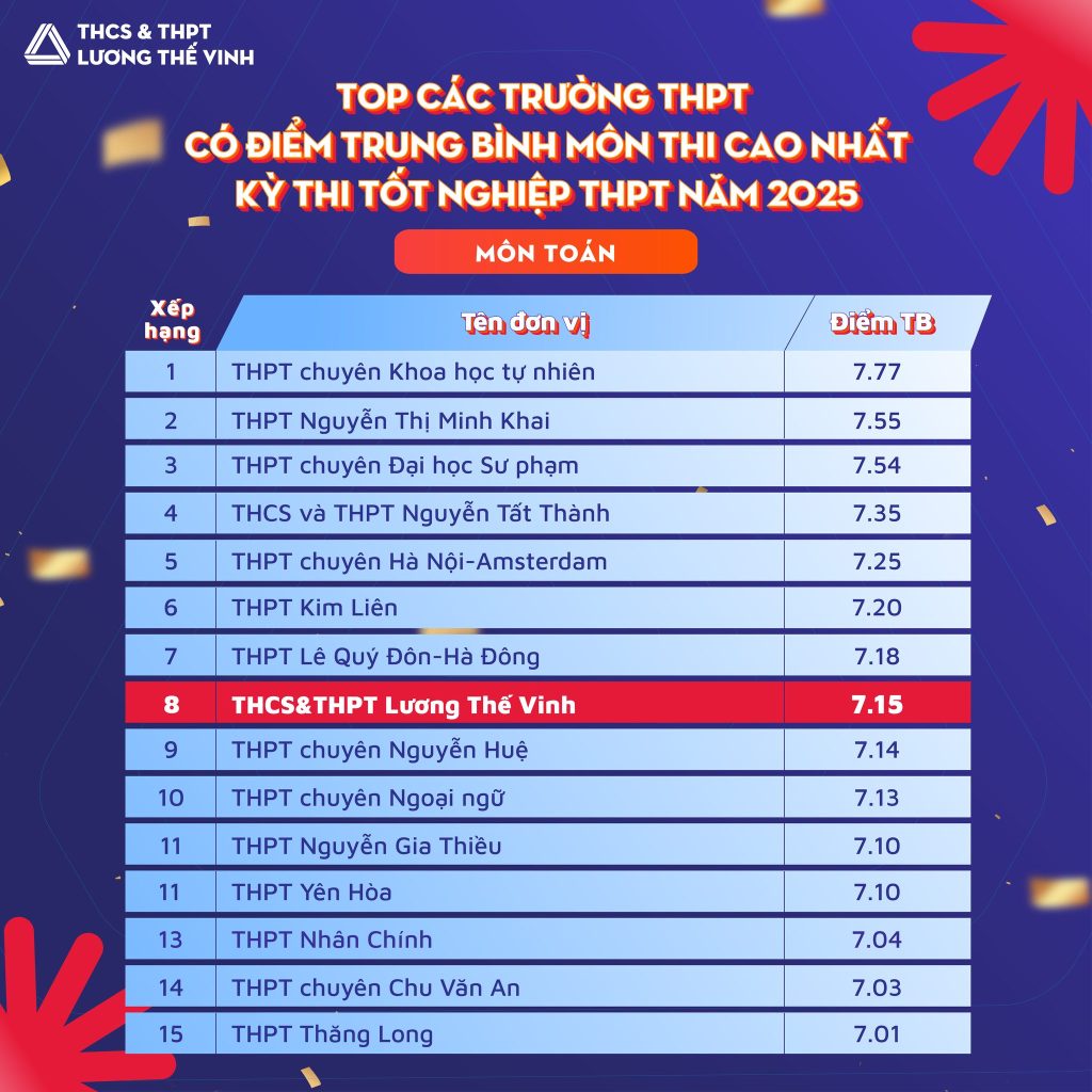 Trong năm đầu tiên kỳ thi tốt nghiệp THPT áp dụng chương trình GDPT 2018, Trường THCS&THPT Lương Thế Vinh tiếp tục ghi dấu ấn khi nằm trong nhóm trường có điểm trung bình cao nhất toàn thành phố ở nhiều môn thi quan trọng: